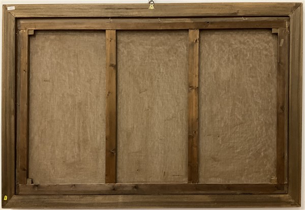 Ignoto, Composizione con frutta su vassoi e tavolo, olio su tela, cm 110x170 in cornice