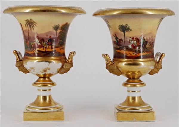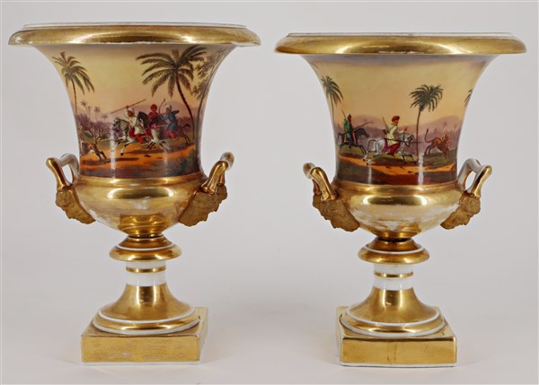 Manifattura del secolo XIX. Coppia di vasi biansati in porcellana decorata in policromia con scene di caccia alle fiere, anse con attaccatura a mascheroni e bordure in oro (h. cm 26) (difetti)