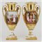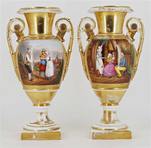 Manifattura del secolo XIX. Coppia di vasi biansati in porcellana decorata in policromia a scene di vita entro riserve su fondo dorato (h. cm 38) (difetti)