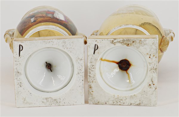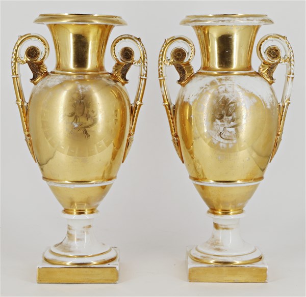 Manifattura del secolo XIX. Coppia di vasi biansati in porcellana decorata in p