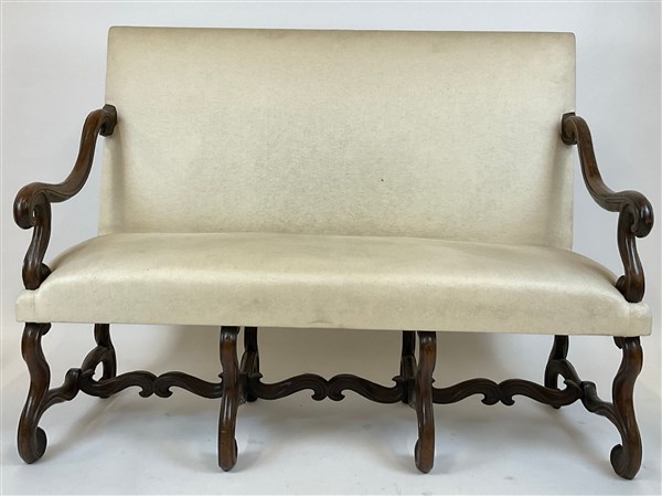 Divano in noce intagliato ad ossa di montone con braccioli, gambe e traverse di raccordo a volute terminanti a ricciolo. Secolo XVIII (L. cm 139) (difetti e restauri)
