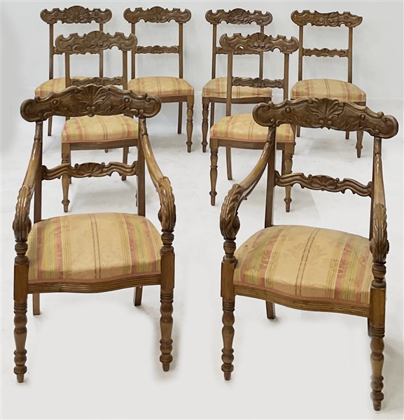 Lotto composto da due poltrone e sei sedie in noce intagliato con braccioli terminanti a ricciolo e schienale con cartelle sagomate a volute, gambe anteriori tornite e posteriori a sciabola. Genova, secolo XIX (difetti e rotture)