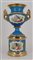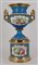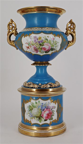 Manifattura del secolo XIX. Grande vaso biansato in porcellana decorata in policromia a fiori entro riserva su fondo azzurro e bordure in oro (h. cm 53) (difetti e probabile coperchio mancante)