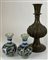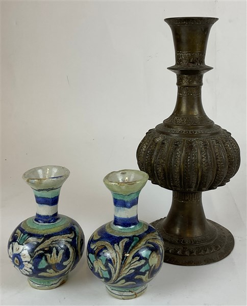 Manifattura di Caltagirone, secolo XVIII. Coppia di piccole bottiglie in maiolica decorata in policromia a foglie e fiori unito ad un vaso islamico porta narghilè in ottone sbalzato, secolo XIX (h. max cm 29) (difetti e restauri)