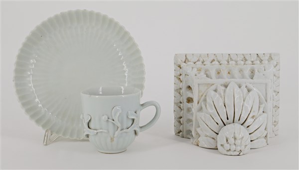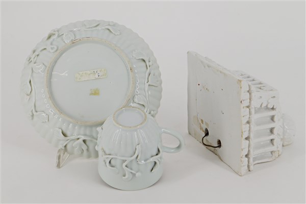 Manifatture diverse, secolo XVIII-XIX. Lotto composto da una tazza con foglie a rilievo e piattino ed una piccola mensola in porcellana bianca (difetti)