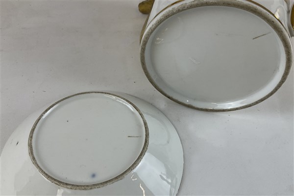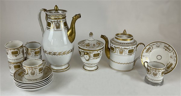 Manifattura del secolo XIX. Servizio in porcellana per sei persone composto da caffettiera, zuccheriera, teiera con coperchi e sei tazze con piattini decorati a palmette e bordure in oro (difetti)
