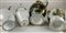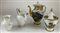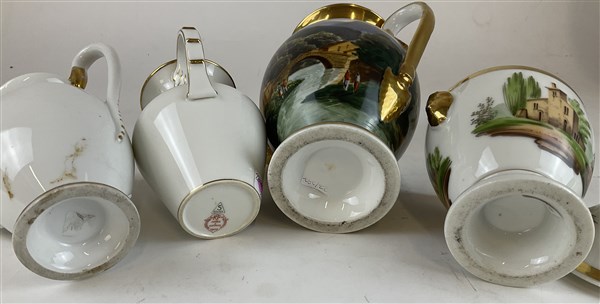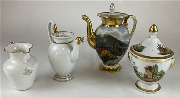 Manifatture diverse, secolo XIX. Lotto composto da due diverse teiere con coperchio in porcellana, una zuccheriera con coperchio e una lattiera, decori a paesaggi policromi e profili in oro, lattiera di epoca successiva con marchio Sèvres (difetti)