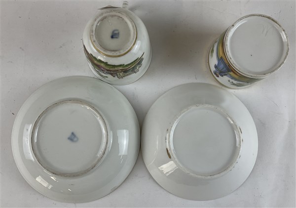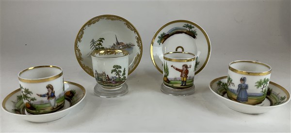 Manifattura di Vienna, secolo XVIII. Lotto composto da una tazza con piattino in porcellana dipinta in policromia a paesaggio con figure e profili in oro, unita a tre tazze con piattino decorate in policromia a figure di fanciulli entro paesaggio di diversa manifattura ed epoca successiva (difetti)