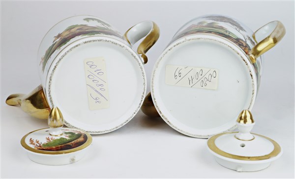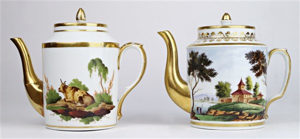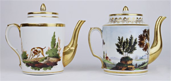 Manifatture del secolo XIX. Lotto composto da due teiere con coperchio in porcellana decorate in policromia a paesaggi con figure e armenti, profili in oro (difetti)