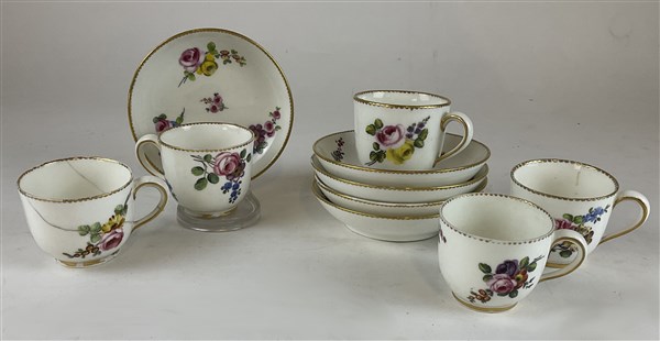 Manifattura di Sèvres, secolo XVIII-XIX. Gruppo di cinque tazze con piattini in porcellana decorata in policromia a fiori, profili in oro (difetti e una tazza ricomposta)