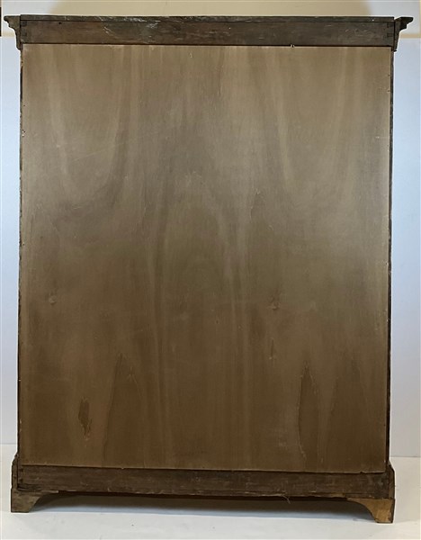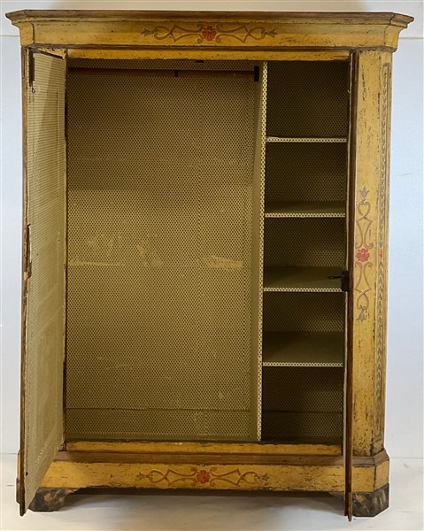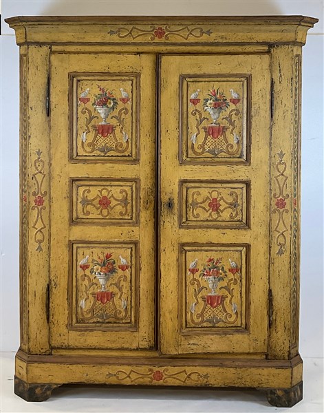 Armadio a due ante e fianchi pannellati in legno dipinto con decori in policromia a vasi fioriti, volatili e volute su fondo ocra. Piedi a mensola a finto marmo. Secolo XVIII (cm 155x205x52) (schienale di epoca posteriore - difetti e sostituzioni)