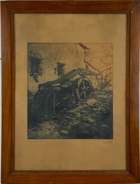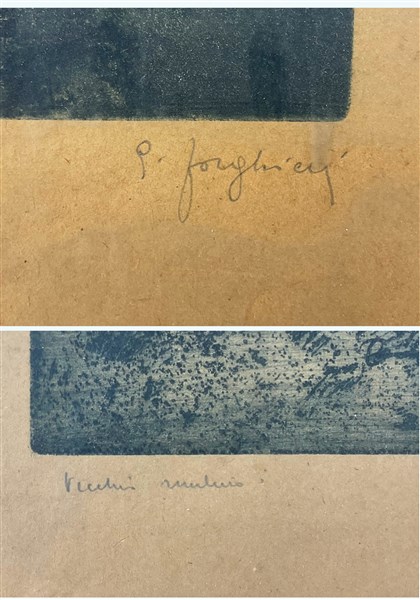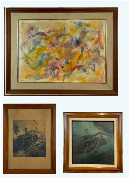Lotto composto da un olio su compensato raffigurante Mulino e firmato Forghieri (cm 48x48), un'acquaforte del medesimo soggetto firmata Forghieri (foglio cm 47x34) e una tecnica mista astratta su carta (cm 48x68) firmata Carnevali, datata '90 e dedicata in basso, in cornici (difetti)