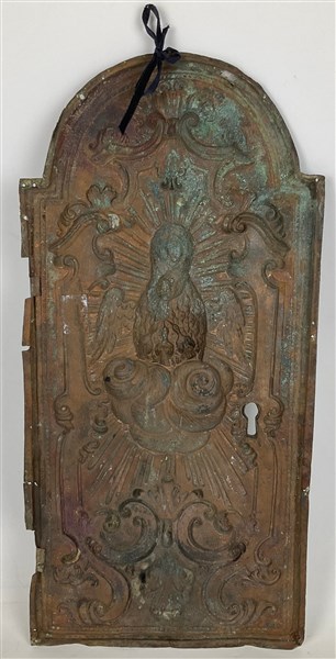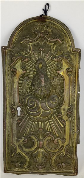Sportello di tabernacolo in rame sbalzato e dorato centrato da pellicano eucaristico entro raggera e volute rocaille. Secolo XVIII (cm 42x20) (difetti)