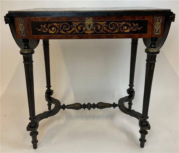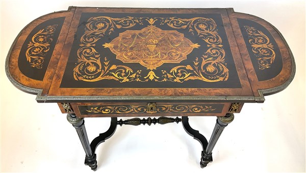 Tavolo ad alette lastronato, filettato e intarsiato a volute e motivi floreali in legni vari, gambe rastremate e scanalate riunite da traverse, un cassetto nella fascia. Profili e fregi in metallo. Secolo XIX (chiuso: cm 69x74x52) (difetti)