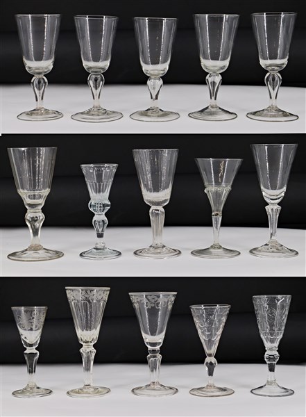 Manifatture differenti, secolo XVIII-XIX. Lotto composto da quindici diversi calici in vetro alcuni con decori incisi (h. max cm 16) (difetti)