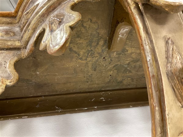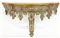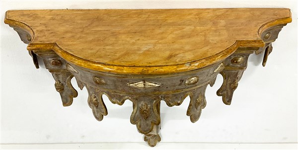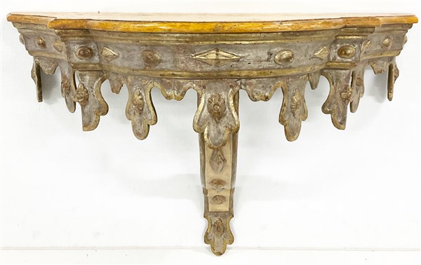 Antica console a mensola in legno intagliato, dorato a mecca e dipinto. Piano sagomato e grembiale mistilineo.Una gamba mossa frontale (cm 110x72x51) (difetti)