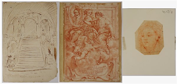 Lotto contenente tre disegni di misure e tecniche differenti di cui uno a sanguigna da una stampa da Ciro Ferri, un ritratto a sanguigna di anonimo del secolo XVIII e uno schizzo architettonico del secolo XVIII raffigurante la Scala dei Giganti a Trieste