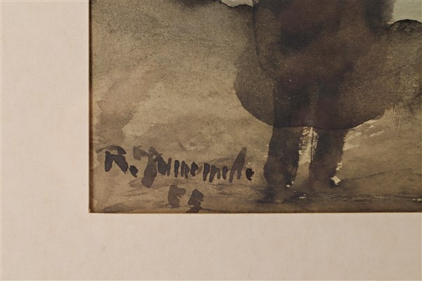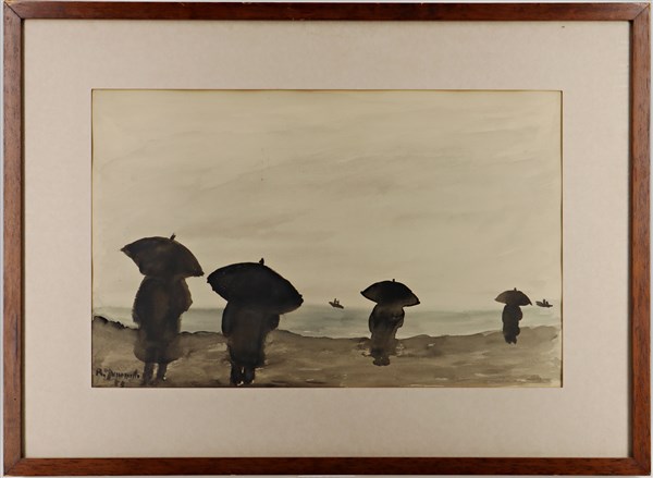 Firma indecifrata "Figure con ombrelli in riva al mare" 1955, acquerello su carta (cm 25,5x39,5) firmato e datato in basso a sinistra