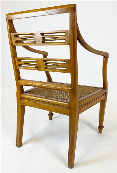 Gruppo di quattro antiche poltrone in ciliegio con schienale traforato e seduta incannucciata (difetti)
