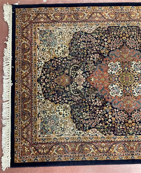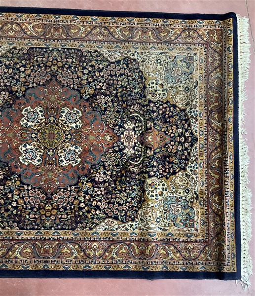 Tappeto meccanico di recente manifattura. Decoro di tipo orientale con medaglione floreale su fondo blu (cm 197x141) (difetti)