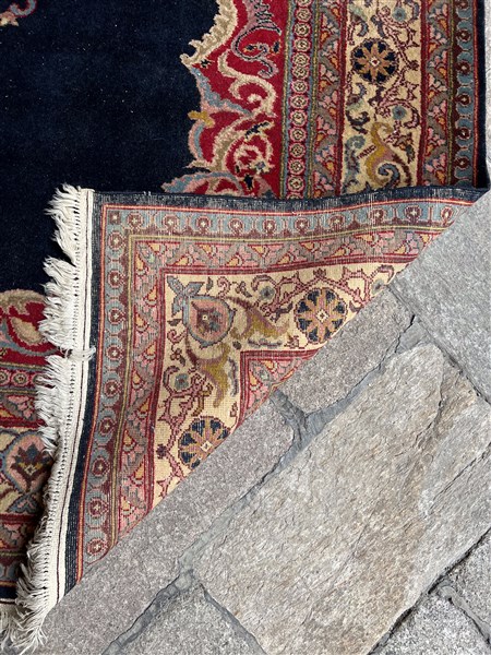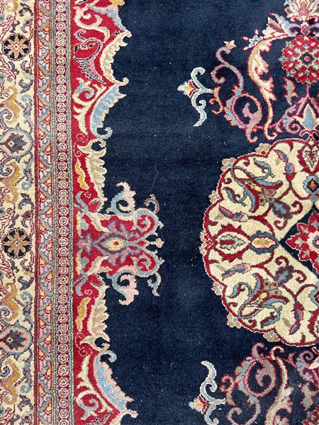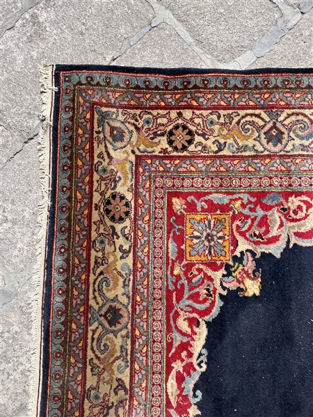 Tappeto Kayseri, Anatolia, inizio secolo XX. Decoro con medaglione centrale con puntali su fondo blu notte (cm 311x219) (difetti)