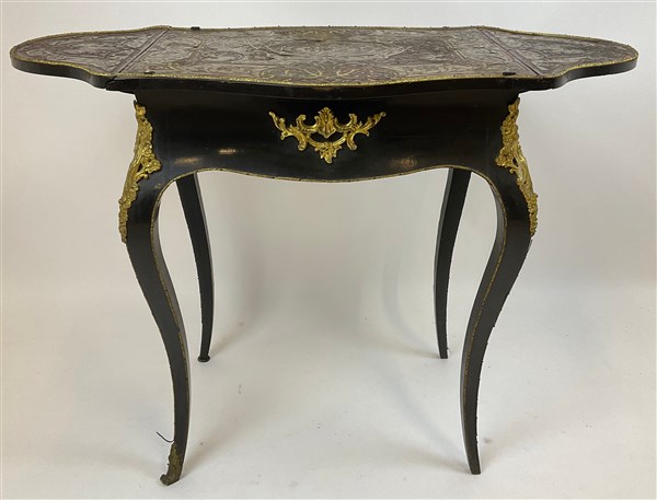 Tavolino da lavoro in legno ebanizzato, in parte intarsiato nei modi Boulle con piano ad alette e fronte ad un cassetto. Decoro a volute floreali in ottone su fondo tartaruga. Gambe mosse, fregi in metallo dorato. Secolo XIX (aperto cm 104x74x46) (gravi difetti e mancanze)