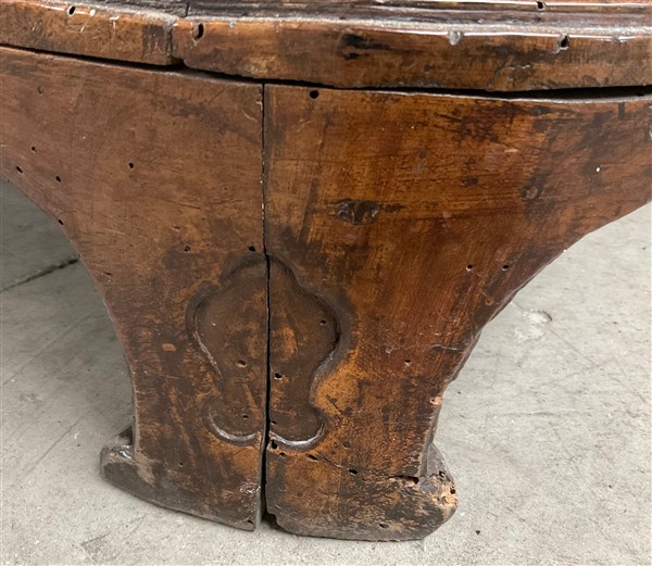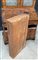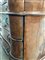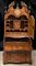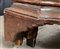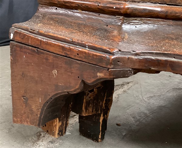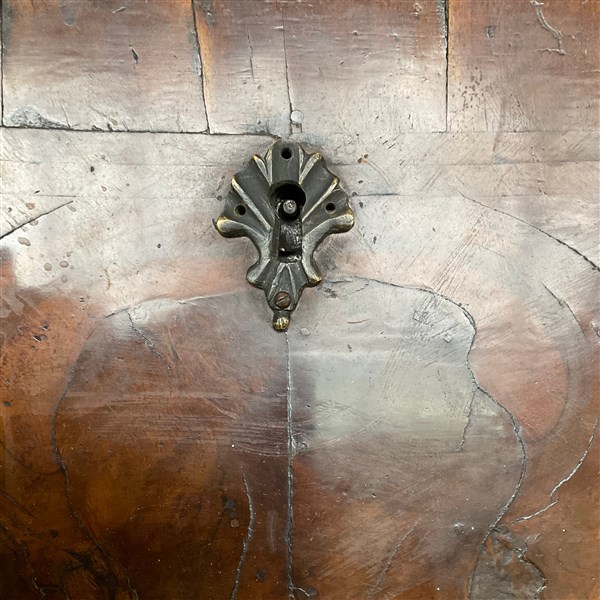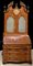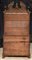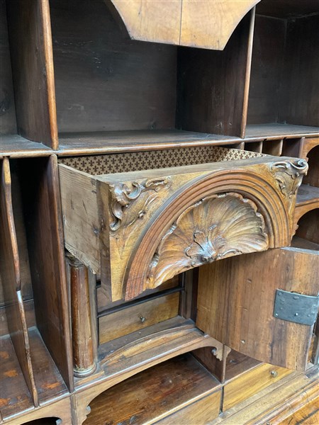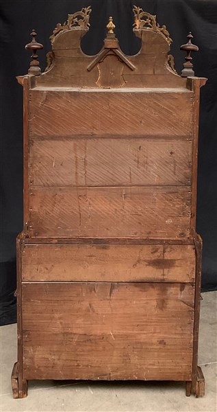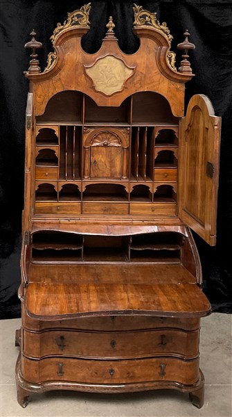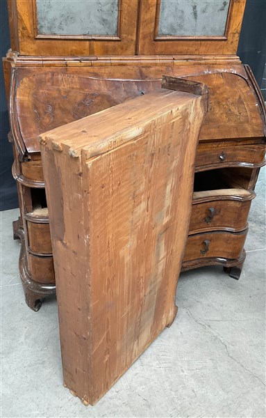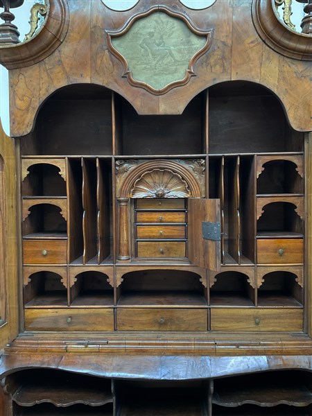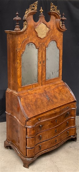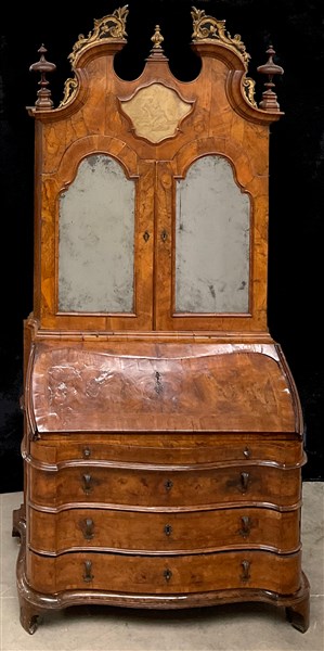 Antico trumeau lastronato in noce e radica di noce, fronte mosso a tre cassetti e calatoia celante vani a giorno. Parte superiore a due ante specchiate e cimasa in legno intagliato e dorato a volute contrapposte, interno con diversi vani, cassetti e anta con centinatura intagliata su semicolonne (cm 127x261x63) (difetti e restauri)