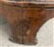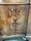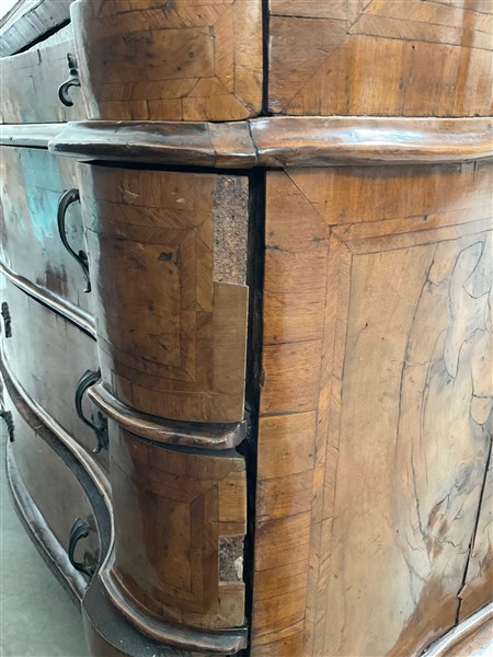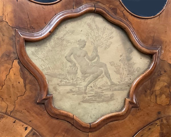 Antico trumeau lastronato in noce e radica di noce, fronte mosso a tre cassetti