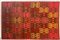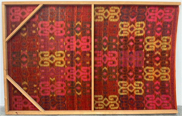 Grande pannello con arazzo tessuto a mano con tecnica jaquard in lana decorato con motivi geometrici ornati in file parallele a formare grandi motivi piramidaliche si differenziano in base alle tinte del filato. Sud America, secolo XX (cm 270x180 ca) (difetti)