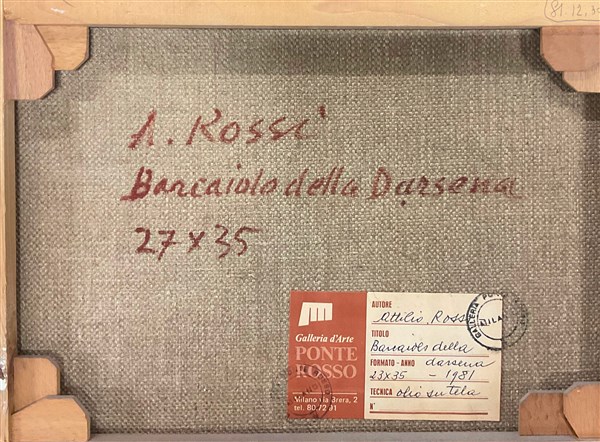 "Barcaiolo della Darsena" 1981, olio su tela (cm 28x36) firmato in basso a destra; firmato, titolato ed etichetta della Galleria Ponte Rosso al retro.