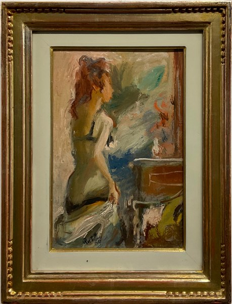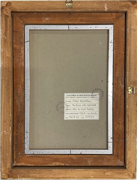 "Nudino allo specchio" 1967, olio su cartone telato (cm 30x20), firmato e datato in basso a sinistra; etichetta al retro della Galleria d'Arte Ponte Rosso, Milano.
