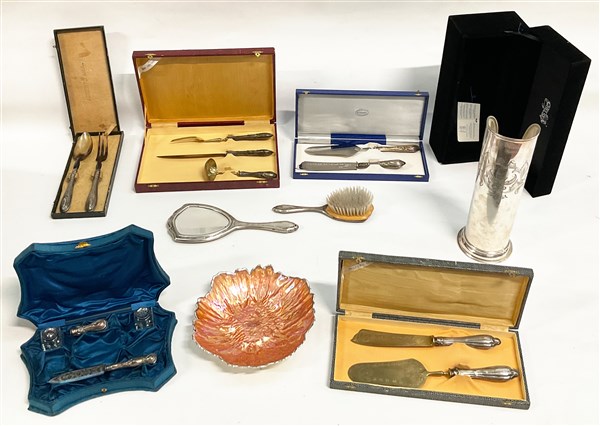 Lotto composto da cinque diversi set laminati in argento entro cofanetto, una spazzola e uno specchio da toilette, uniti ad un centrotavola in vetro smaltato e argentato e un portabottiglia in metallo argentato (difetti e rotture)