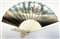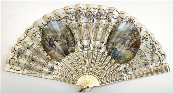 Arte del secolo XIX. Lotto di tre ventagli con stecche in avorio inciso, traforato e dorato, di cui uno con decori a chinoiserie. Pagine in carta e tessuto decorate da scene galanti e di genere (difetti e restauri)