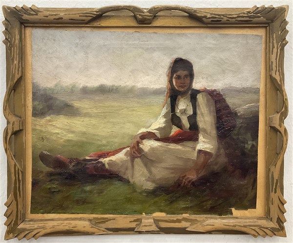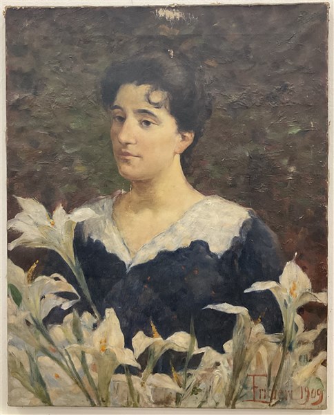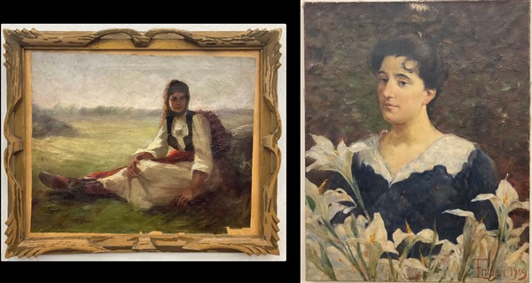 Ignoto del secolo XIX, Lotto composto da due oli su tela raffiguranti figure femminili. Di diverse misure. Di cui uno firmato e datato in basso a destra. Uno in cornice (difetti e mancanze)