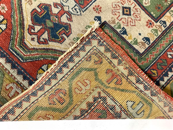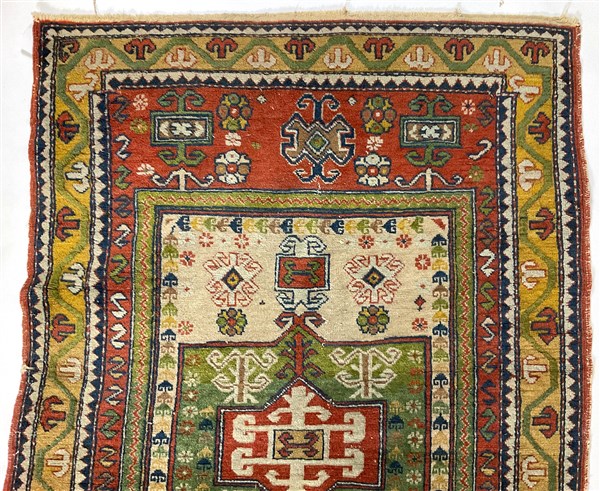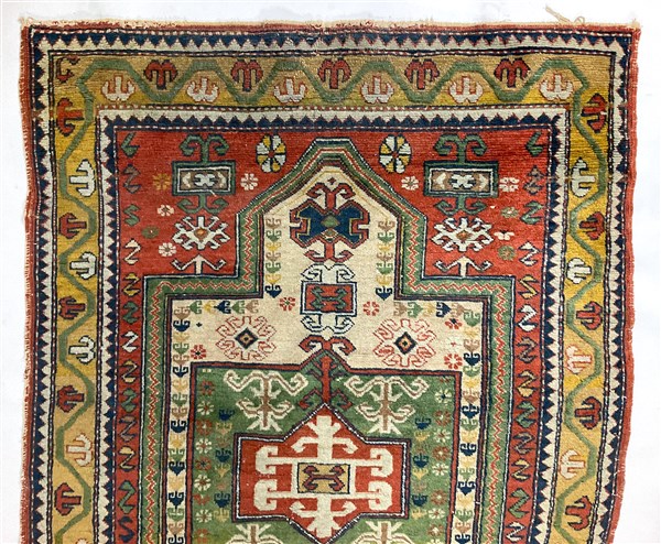 Tappeto preghiera Kazak Sevan, Caucaso, inizio secolo XX. Decoro con Mirab a fondo bianco ornato da un medaglione polilobato su fondo verde. Bordura a meandro a fondo giallo (cm 144x96) (difetti)