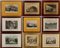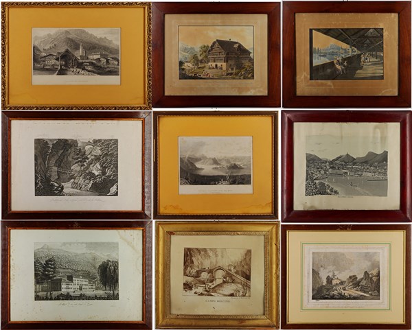 Lotto di nove stampe di soggetto, epoca e dimensioni differenti raffiguranti paesaggi, in cornici (difetti)