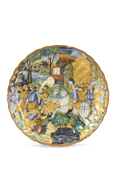 Manifattura del secolo XIX, nei modi urbinati di Orazio Fontana. Alzata in maiolica a profilo ondulato decorata in policromia con scena del sacrificio di Marco Curzio (d. cm 29,5) (difetti e sbeccature)