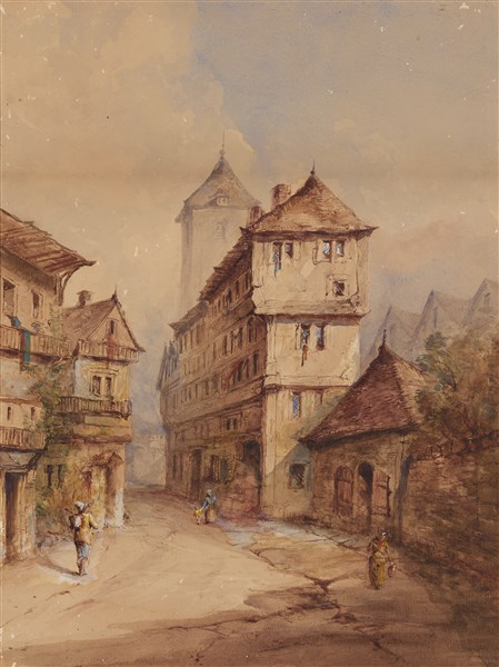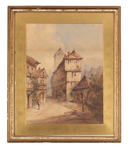 Scuola inglese del secolo XIX "Strada di paese" acquerello su carta (cm 70x54