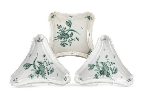 Manifattura Cerreto Sannita, secolo XVIII. Lotto composto da una coppia di piatti trangolari ed uno quadrangolare in maiolica con decoro in monocromo verde a motivo floreale (cm max 25,5x25,5) (lievi difetti)