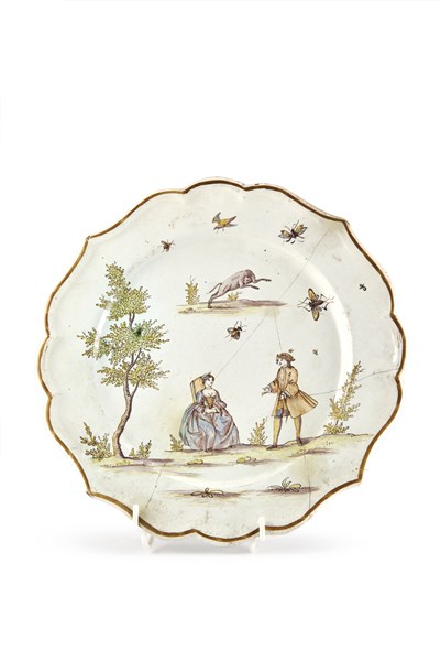 Manifattura di Felice Clerici, Milano, secolo XVIII. Piatto polilobato in maiolica con decoro policromo a "paesini e figure a smalto" entro paesaggi ed insetti sparsi. Marcato "Milano" al retro, con etichette cartacee (d. cm 23,5) (ricomposto)