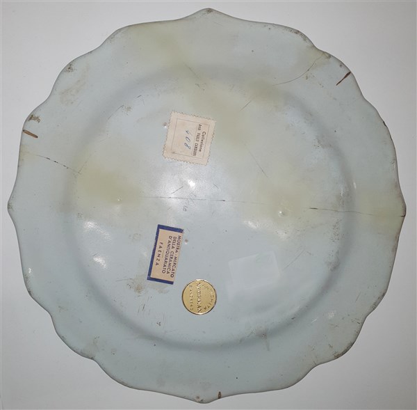 Manufacture of Felice Clerici, Milan, 18th century. Majolica plate with polychrome decoration. Marked "Milano" on the back, with paper labels (d. cm 23,5) (recomposed)