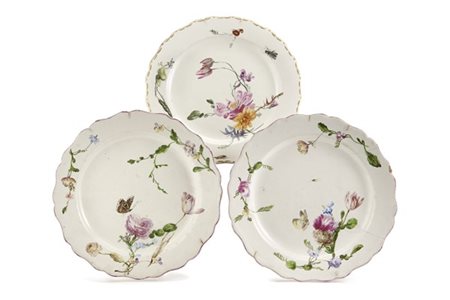 Manifattura di Marsiglia, secolo XVIII. Lotto composto da tre piatti in maiolica dipinta in policromia decorati a rami fioriti, farfalle e insetti, di cui due con profili porpora ed uno in oro. Recanti al retro etichette cartacee (d. max cm 25) (difetti e felature)