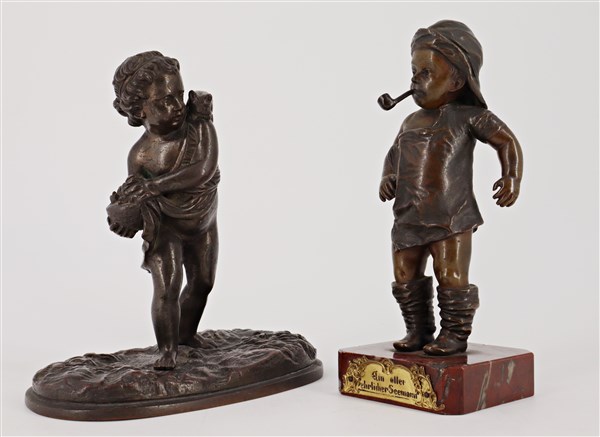 Lotto composto da due sculture in bronzo raffiguranti "Bambino con gatto" (cm 1