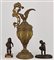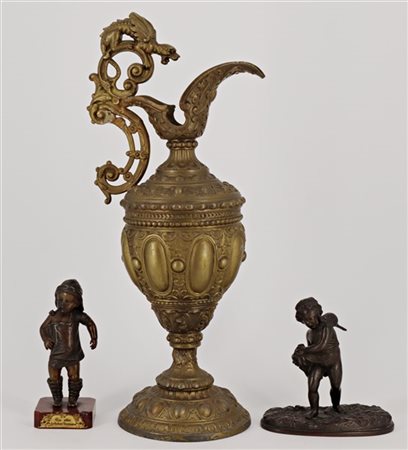 Lotto composto da due sculture in bronzo raffiguranti "Bambino con gatto" (cm 15x15) e "Bambino" con pipa" (h cm 17), unite ad un versatoio in metallo con ansa a foggia di dragone (h cm 46) (difetti)