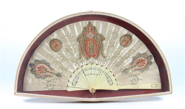 Ventaglio con stecche in osso inciso e traforato con motivi floreali. Pagina in raso di seta grigio perla decorata con applicazioni di tessuto Kashmir e ricami a punto catenella in argento dorato. Entro teca sagomata (cm 57x33) (difetti)