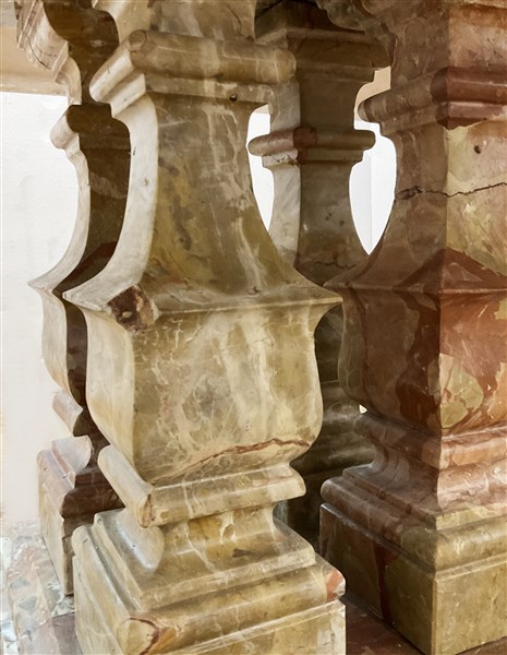 Tavolo da salotto in marmo con gambe centrali a balaustro su base quadrata, realizzato con marmi differenti fra cui il Macchiavecchia (cm 150x68x150) (difetti, sbeccature e restauri)