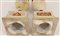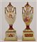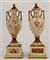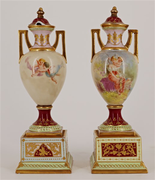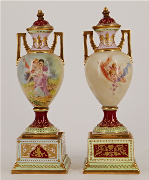 Coppia di vasetti biansati in porcellana decorata in policromia con profili in oro (difetti, restauri e rotture ad un coperchio)