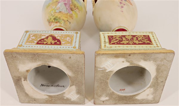 Coppia di vasetti biansati in porcellana decorata in policromia con profili in