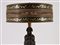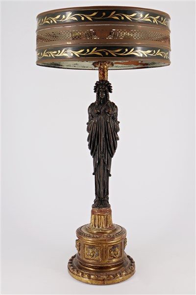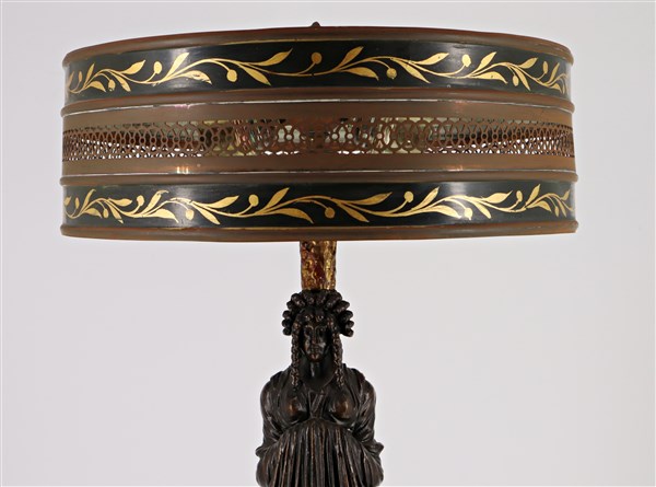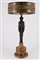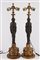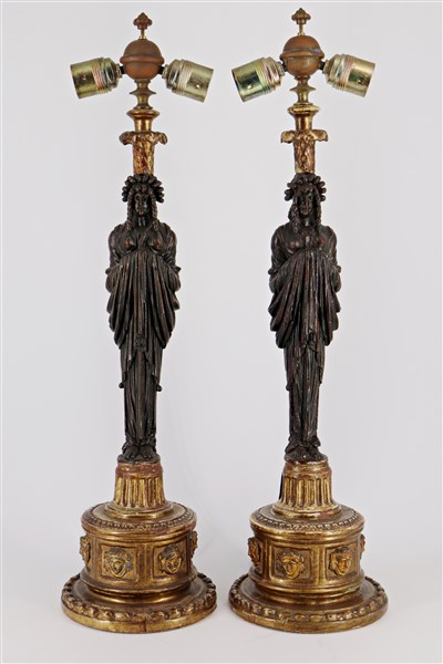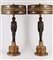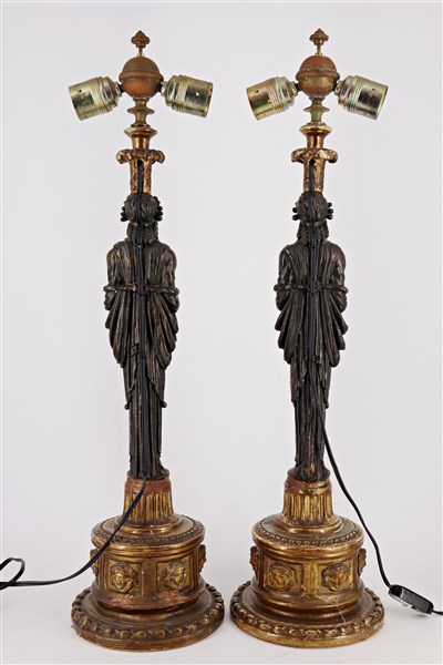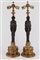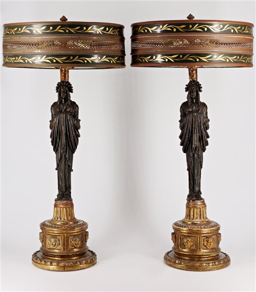 Coppia di candelabri Impero in legno intagliato e patinato a figura di erma su base in legno dorato, secolo XIX, adattati a lampada in epoca successiva con paralumi in metallo. (h cm 62) (difetti)