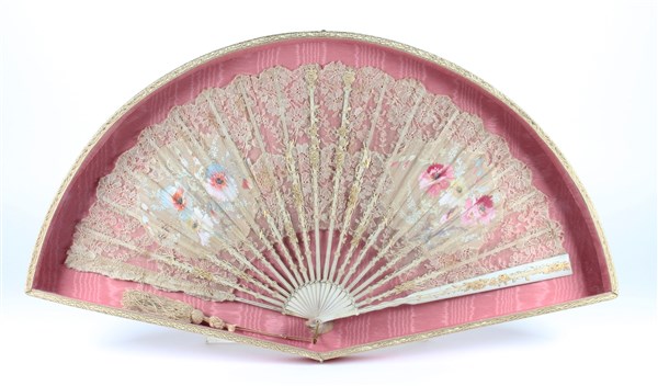 Ventaglio con stecche in legno laccato inciso e dorato con dedica alla base "Mi è sempre caro" . Pagina in pizzo ad ago con due inserti di tessuto di seta dipinta con motivi floreali. Entro teca sagomata (cm 76x42) (lievi difetti)